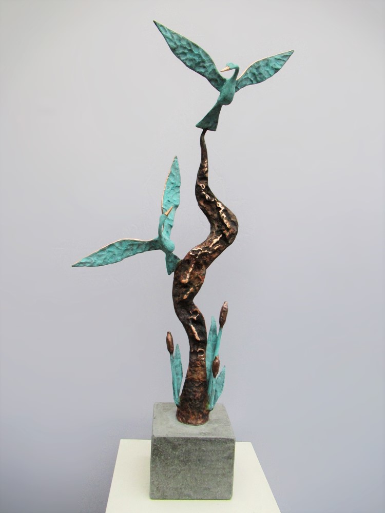 Ronan’s swan pieces are inspired by the Irish legend of the ‘Children of Lir’, and depict four birds emerging magically from the water. Graceful species such as the curlew, hummingbird and swallow are achieved through careful observation of the natural forms and movement of the creatures. The sculptures are created through a process of heating, hammering, and welding copper pipes, sheets and wires to reach the desired shape. The copper is treated with a blue patina, or heated and polished to bring out the natural warm orange and red tones of the metal. Larger bird pieces make striking garden sculptures, blending beautifully with the natural environments that inspired them.